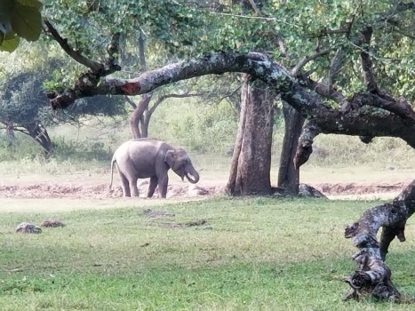 Young, feisty elephant eating salt