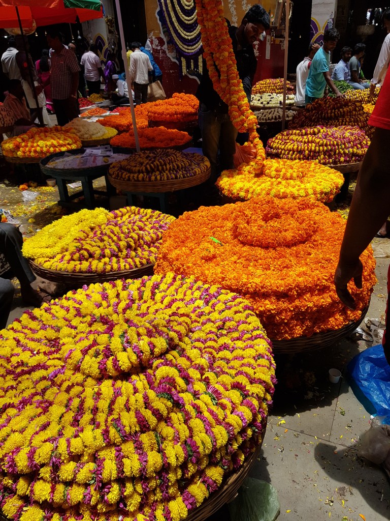 Previous Image Next Image 20170826_122623 We were struck by the fact that there were no cut flowers — only these strings of blooms intended for worship and ceremony.