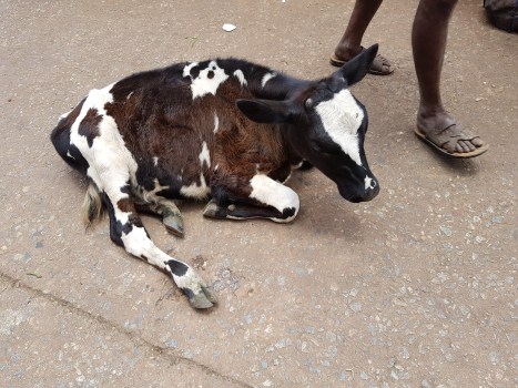 A cute little baby cow among the produce.