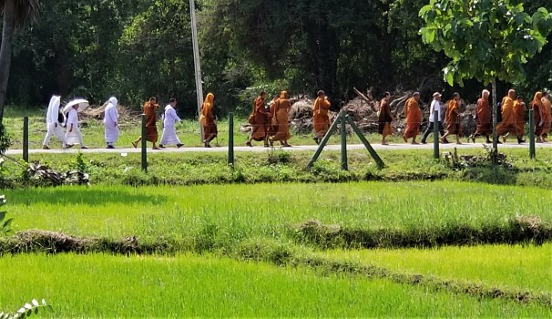 Pilgrims in white and monks in saffron walk between sites